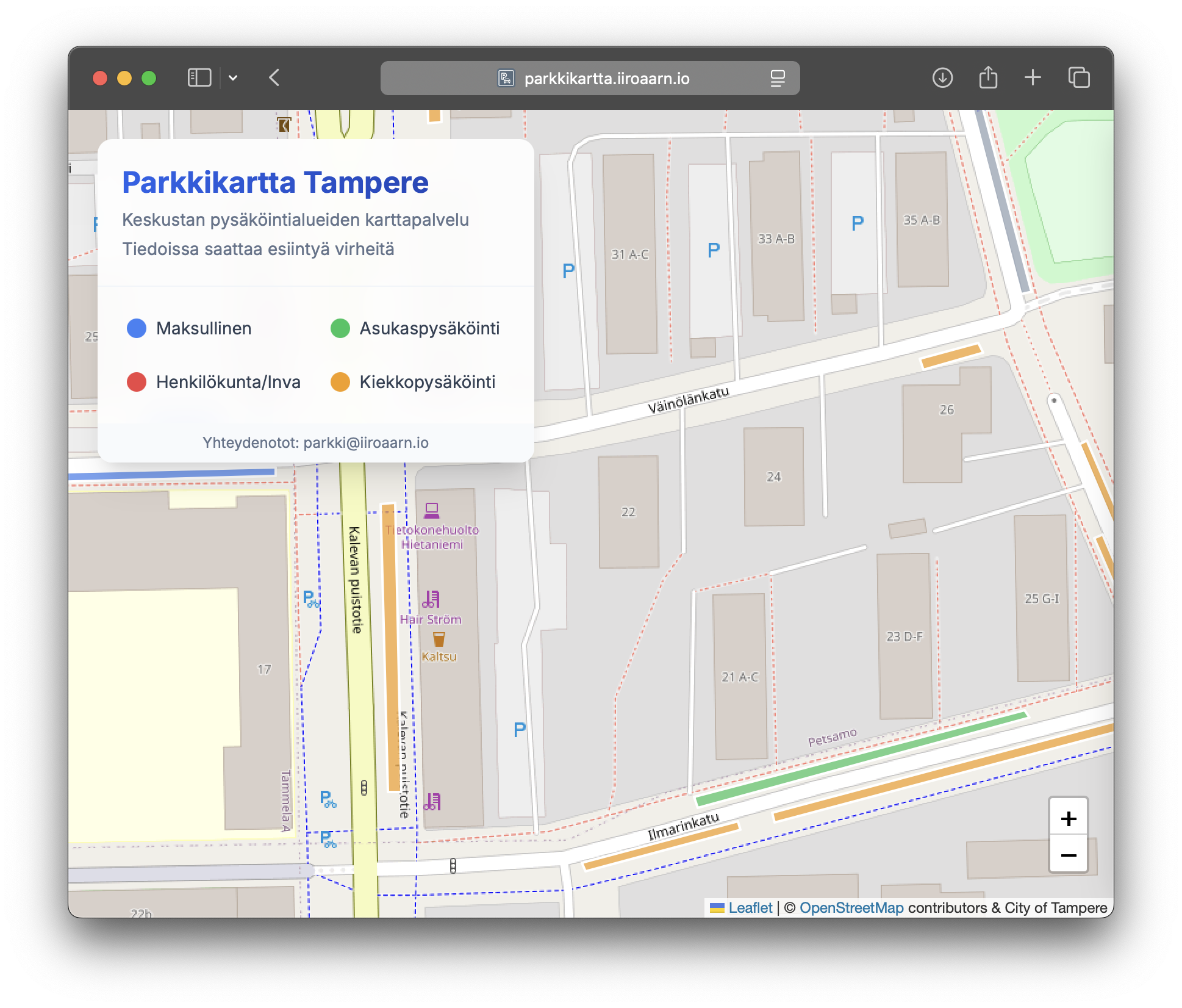 • Parking information is based on open data provided by the City of Tampere (data.tampere.fi).