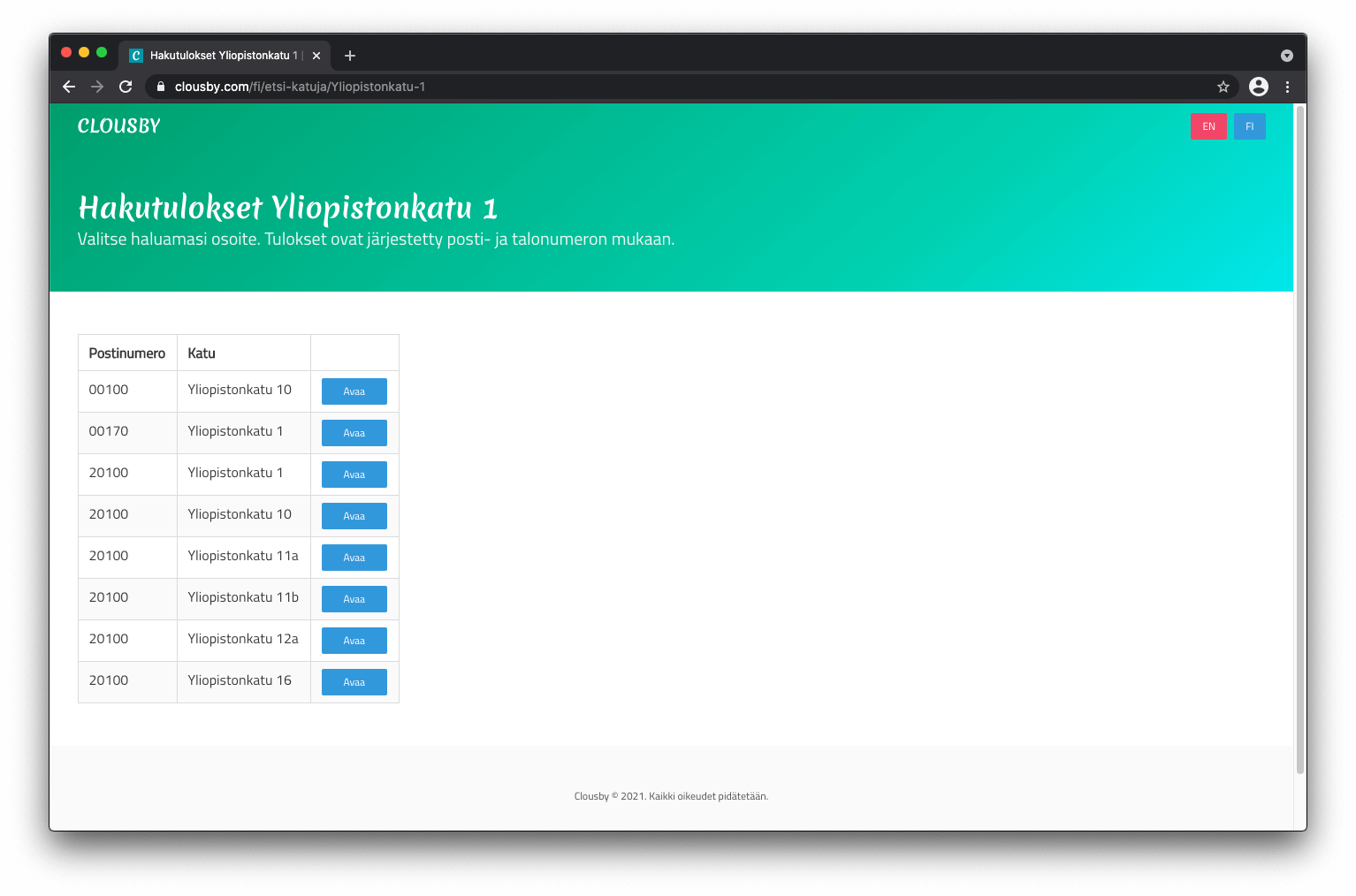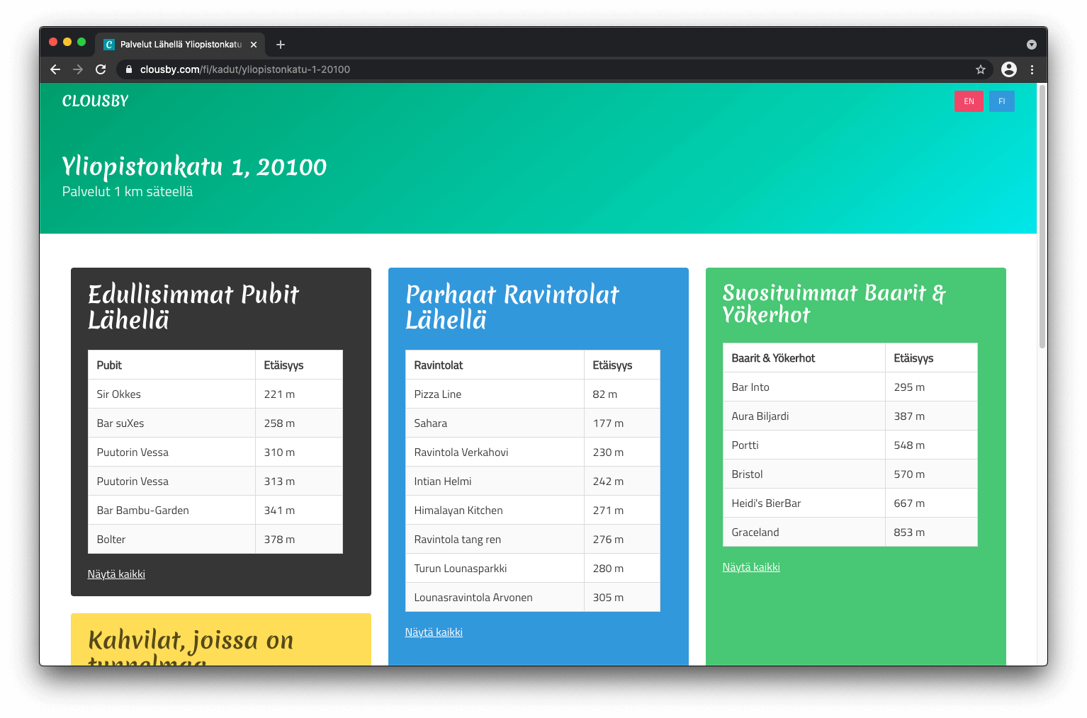 Every address got a unique slug field that includes street/avenue, housenumber, and a postal code (e.g. "yliopistonkatu-2-20100"). This slug field allowed creating a unique "homepage" for each address. The homepage includes the services that are near the given street (e.g. https://clousby.com/en/streets/yliopistonkatu-2-20100).