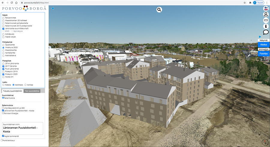 Kunta3D is a publication of 3D materials and a communication platform produced for municipalities. With the help of Kunta3D, local residents can participate in the development of the city by monitoring projects, commenting and even proposing the construction of new types of sites.