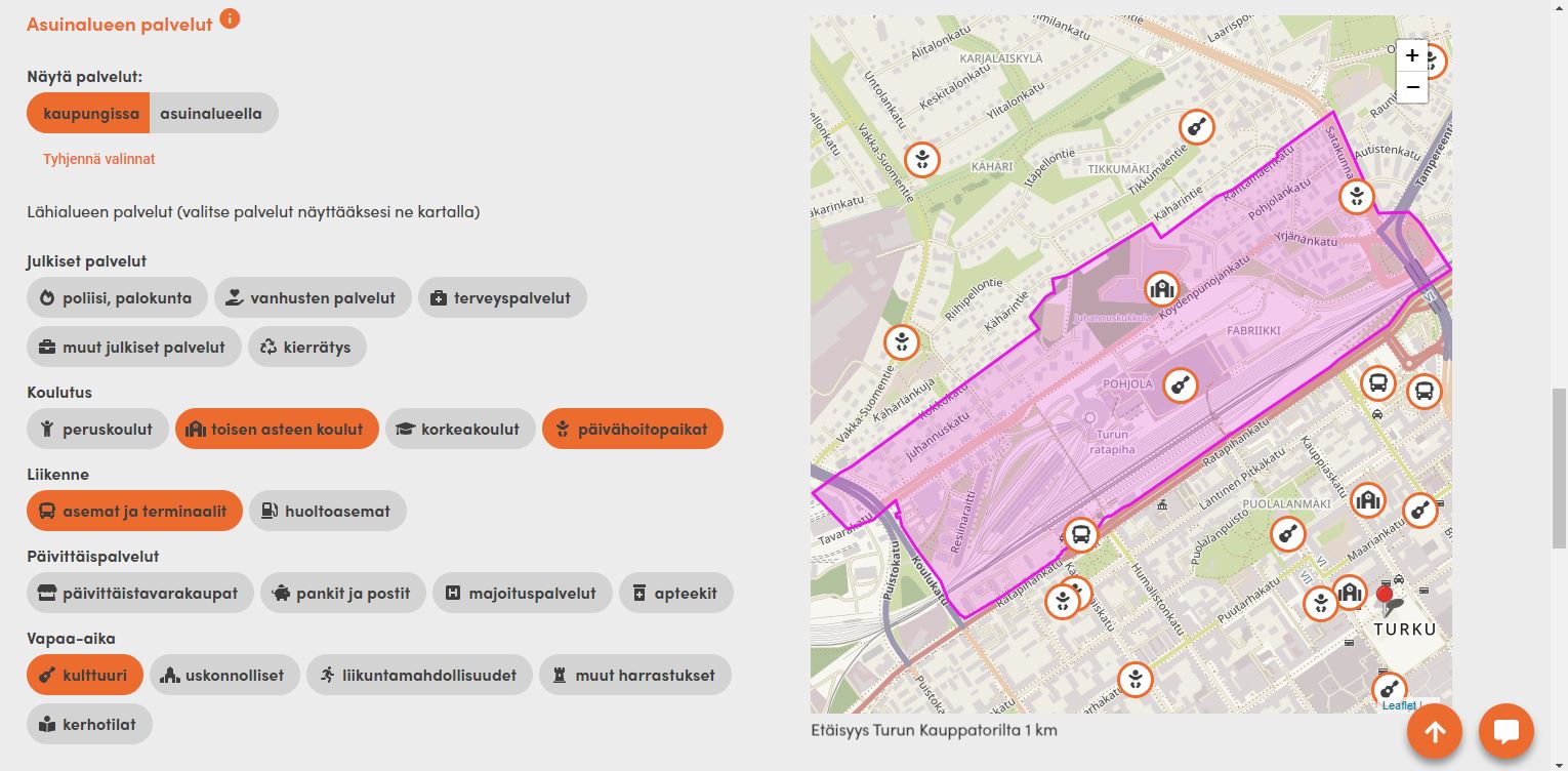 - Varsinais-Suomen liiton vuonna 2012 ja osin 2013 keräämä ja osoitepaikantama, ja Varsinais-Suomen kuntien vuoden 2014 alussa tarkistama aineisto valikoiduista palveluista maakunnan alueelta. 18.5.2016 päivityksessä on tehty korjauksia Turun kaupungin palvelupisteisiin, lisätty uusia ja poistettu vanhoja sekä korjattu tietoon tulleita virheitä muiden kuntien alueella aineistossa. Know Your Hoods -palveluun tuodut pisteet on päivitetty 7/2019, päivitykset vain Know Your Hoodsissa, ei alkuperäisessä aineistossa.