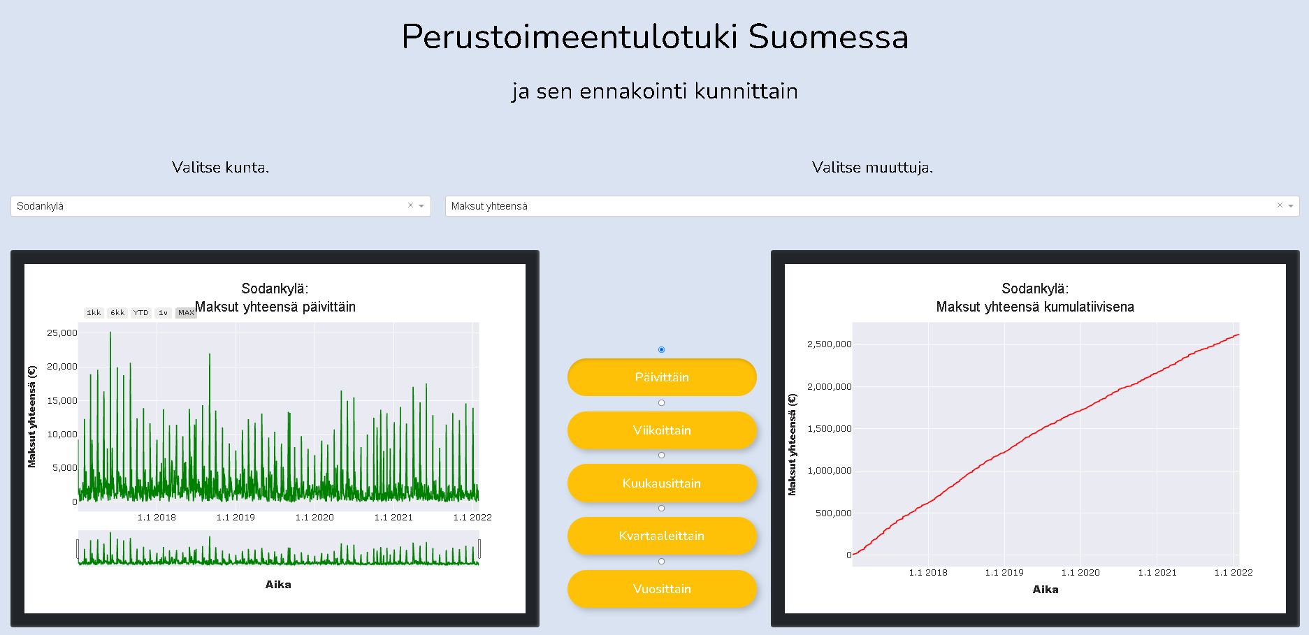 Tämä sovellus hyödyntää Kelan tilastoimia päivittäistä dataa toimeentulotukien maksuista ja palautuksista ja pyrkii muodostamaan koneoppimisen avulla ennusteen tulevaisuuteen. Käyttäjä voi valita haluamansa tukilajin sekä kunnan alasvetovalikoista, tarkastella toteumadataa sekä tehdä valitun pituisen ennusteen.