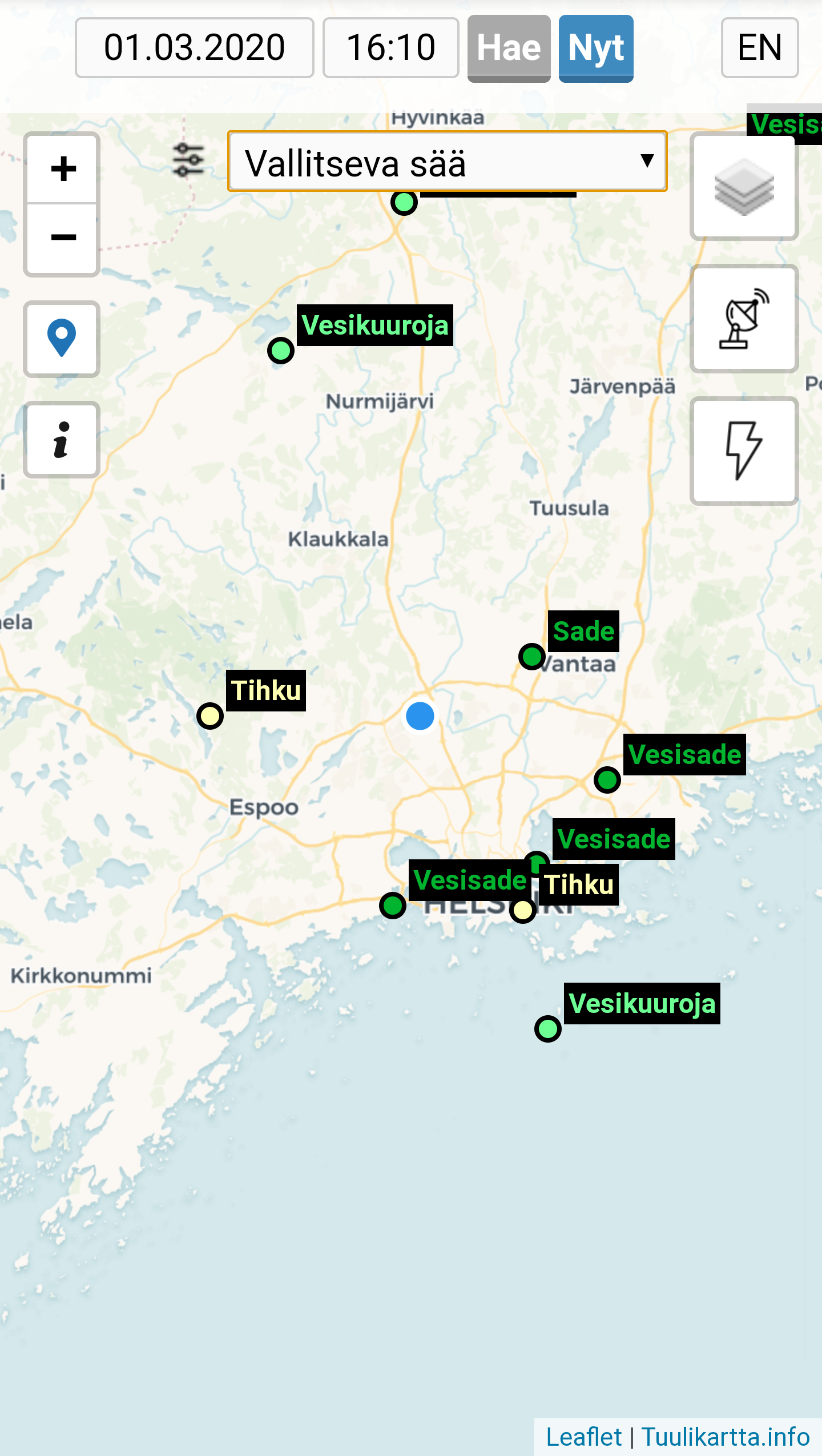 Sivustolla voi tarkastella Ilmatieteen laitoksen havaintoasemien sekä Liikenneviraston tiesääasemien keskituulen sekä maksimipuuskan, lämpötilan, sademäärän, näkyvyyden, kokonaispilvisyyden, havaitun vallitsevan sään sekä lumensyvyyden 10 minuutin välein päivittyviä havaintoja. Näiden lisäksi kartalle voi lisätä erillisenä tasona myös sadetutkakuvan sekä salamahavaintoja.