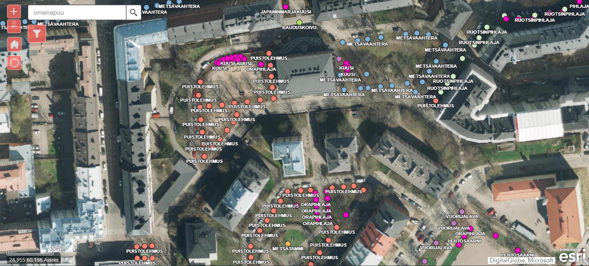 Voit myös paikantaa itsesi kartalle ja selvittää minkälaisten puiden vieressä oleilet. Hakua käyttämällä näet, missä tietyntyyppisiä puita esiintyy. Halutessasi voit rajata sivuston näyttämään vain tietyt puulajit, kuten vaahterat.