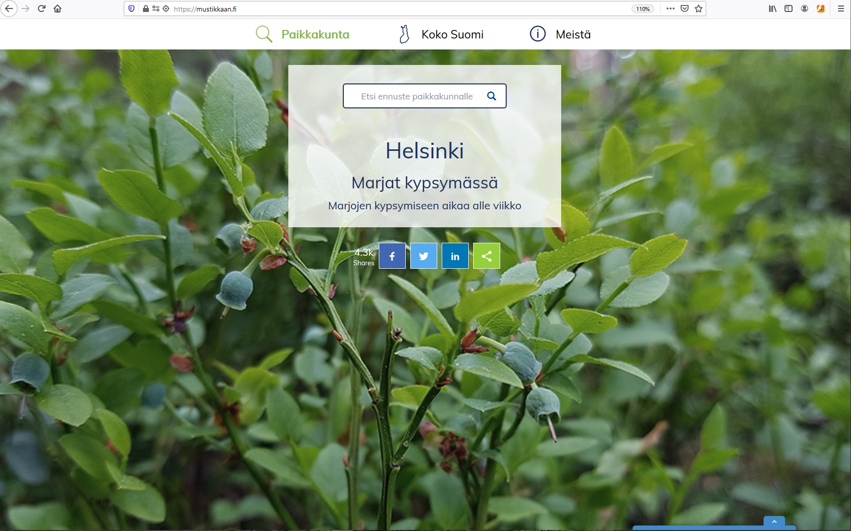 Mustikkaan.fi on sovellus, joka laskee ennusteen mustikan kypsymiselle. Ennuste lasketaan päivittäin Ilmatieteen laitoksen avoimen sääaineiston (HIRLAM) perusteella, koko Suomen kattavassa 10*10km hilassa. Ennuste julkaistaan webbi-sivulla, jolla voi hakea tulokset haluamalleen paikkakunnalle, tai tarkastella ennustetta kartalta. Malli pohjautuu lämpösummamalliin.